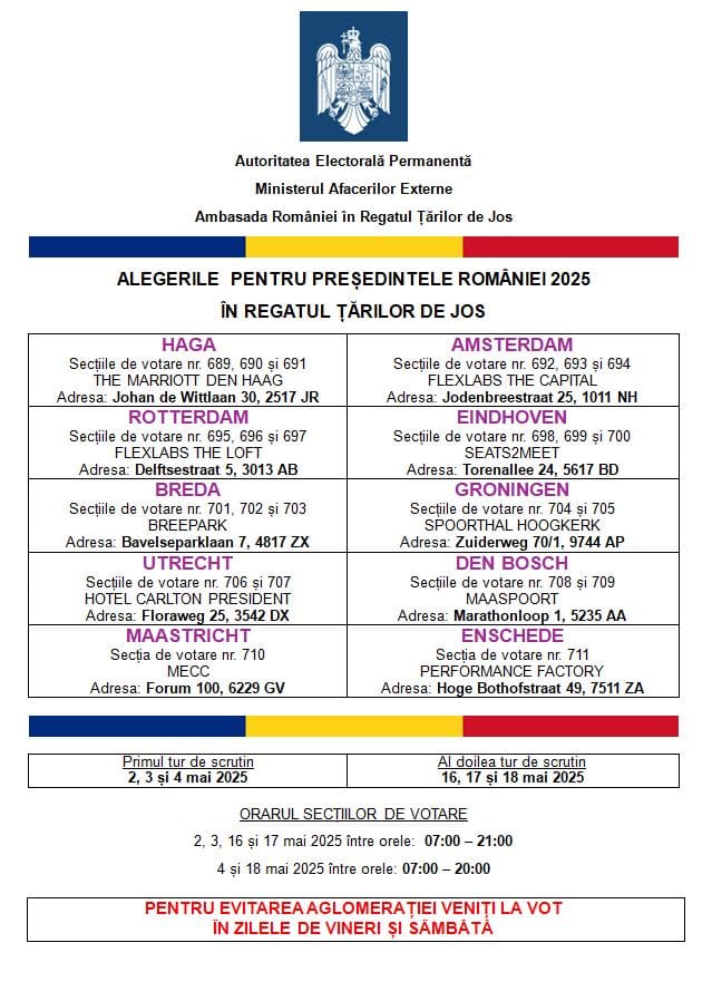 The Permanent Electoral Authority, the Ministry of Foreign Affairs, and the Embassy of Romania in The Hague will organize the elections for the President of Romania in the Kingdom of the Netherlands in May 2025.