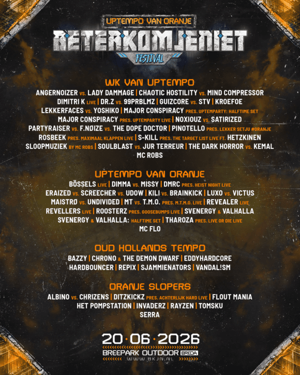 BKJN Festival heeft de oranjekoorts flink te pakken. Voor haar tweede editie keert het evenement volledig in stijl terug naar Breepark Outdoor, voor Uptempo van Oranje. Tijdens de eerste editie van het event keerde de organisatie terug naar de basis: “Rammen, raggen en rondjes lopen. Bass door je botten en zweet op je voorhoofd. Wij tekenen geen lijntjes, wij breken ze.” Ook dit jaar blijft de organisatie op dit pad: “Fuck telefoons. Fuck de rest. Hier en nu, dat is wat telt.”